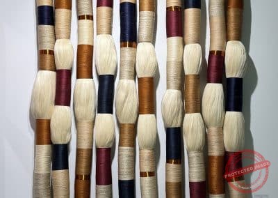The booth of the Miami-based gallery Wolf & Nomad, which specializes in contemporary Latin American artwork, also left a strong impression on me. Particularly striking were the vibrant, abstract paintings by Christian Abusaid. Even more remarkable were the wall hangings in fique fiber created by Alejandra Aristizabal, who employs dried fibers from this plant, native to the South American Andean region. Aristizabal’s process involves brushing, assembling, and knotting these fibers together with colorful ties or brass threads. What stood out to me was how Alejandra directly supports the indigenous communities in this region who help her in harvesting and drying the fibers, adding a layer of ethical engagement to her beautiful artworks.